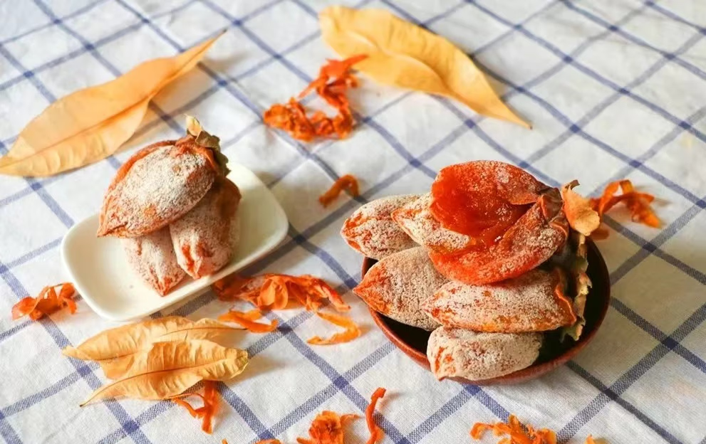 富平柿饼以当地生产的传统名优柿子品种“富平尖柿”为原料,经过清洗削皮、日晒压捏、捏晒整形、定型捂霜等多道工序精细制作而成。“吊柿饼”是陕西富平县的传统。成熟的柿饼经过晾晒,一排排整齐地从架上垂挂下来,如一面面橘黄色珠帘,弥漫着淡淡果香。富平柿饼有四个特点,即甜、软、糯、香。柿饼肉多霜厚,入口即化,甜美入心。